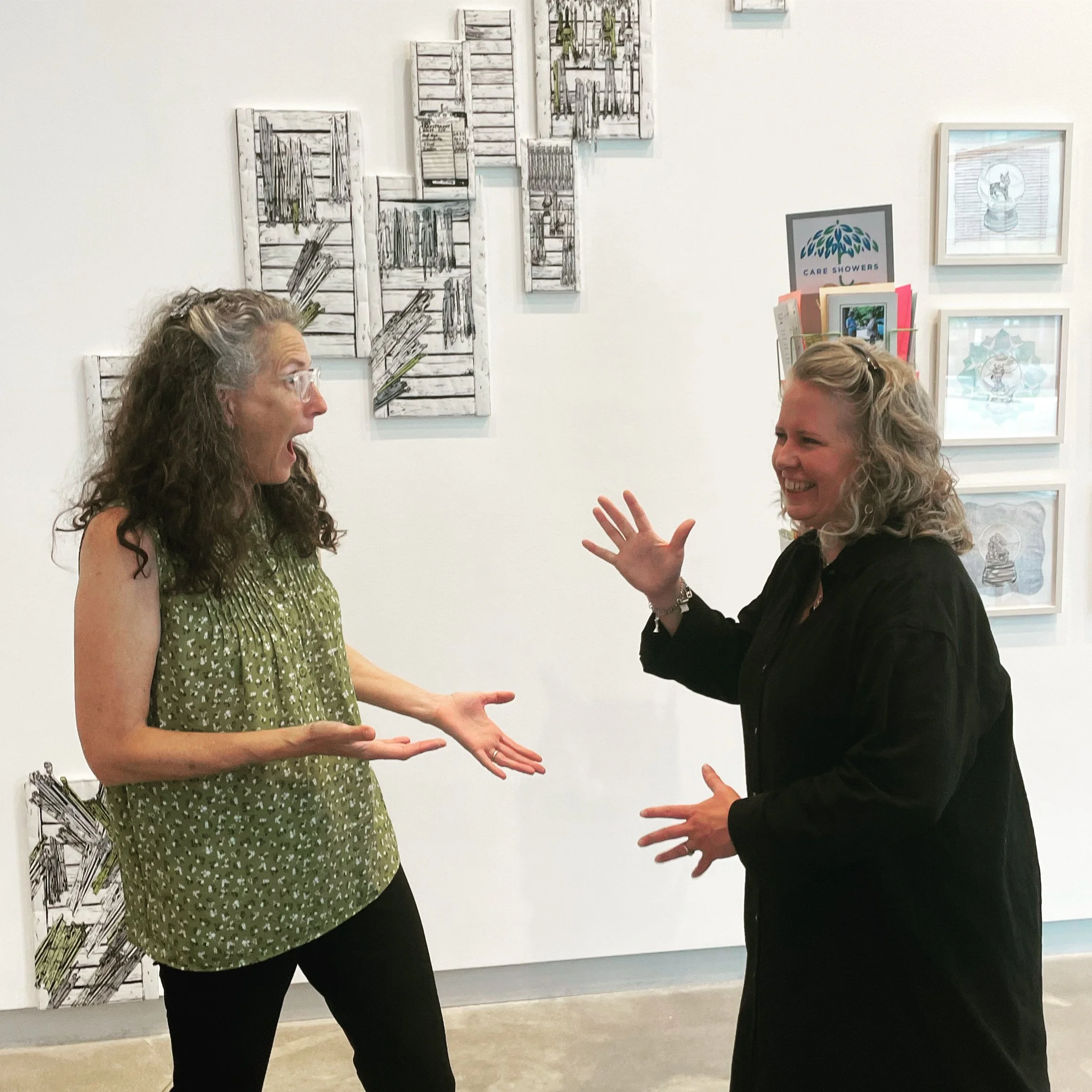 Below, Anne and Jessica recreate the “origin” aha moment - we are going to make Care Showers! (in the gallery of the Art Lit Lab, Madison, WI, July 2023).