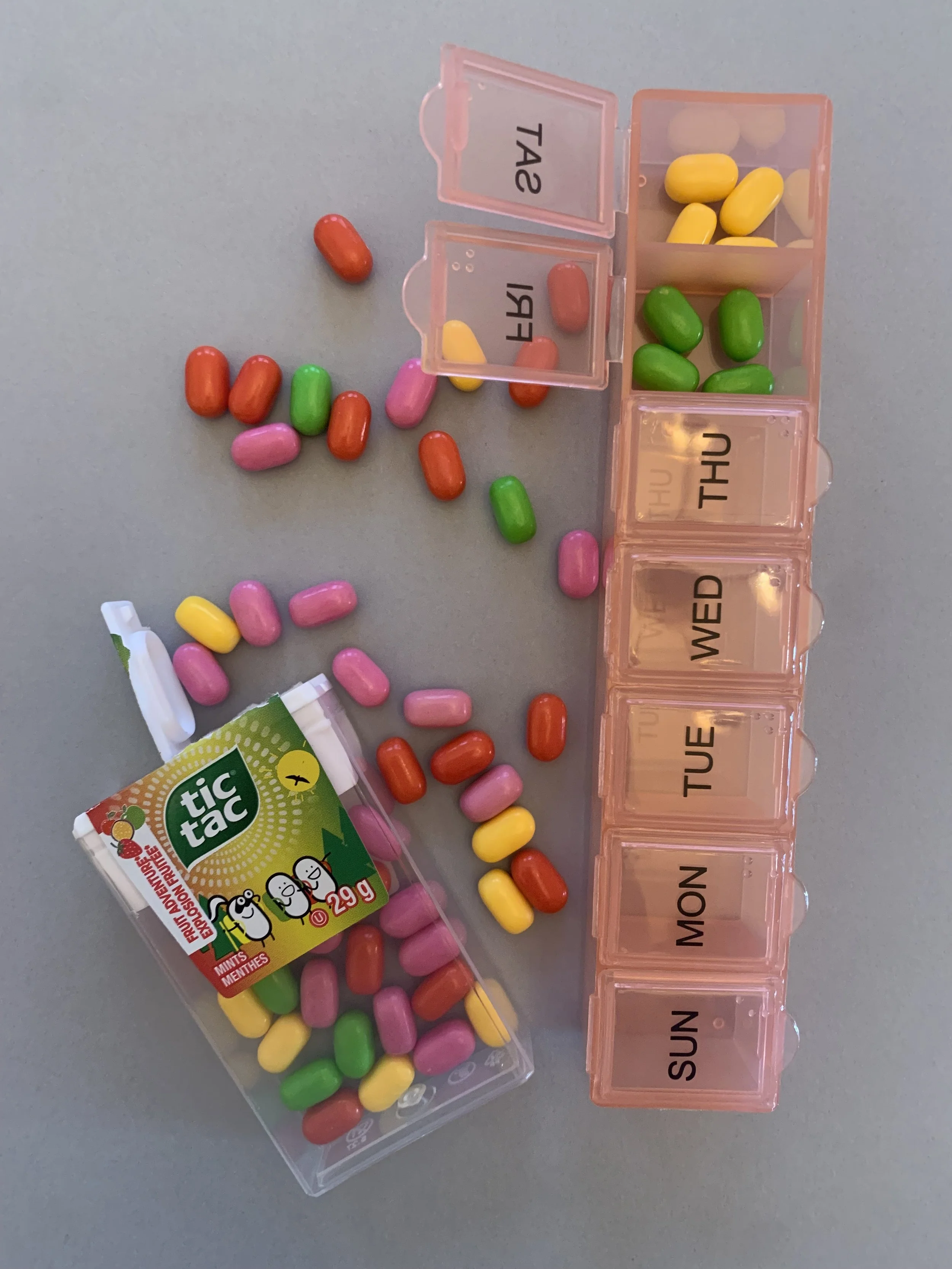 3) When we so “GO!” put 4 Tic Tacs of the same color into a weekly spot in the organizer.